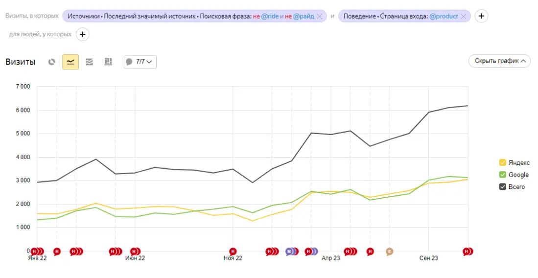 Сравним трафик за аналогичные периоды 2022 и 2023 — здесь тоже все супер:
