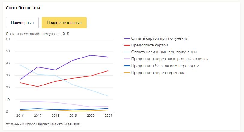 По исследованию Яндекс Маркета и компании GfK Rus, каждый второй покупатель предпочитает оплачивать заказ картой при получении.