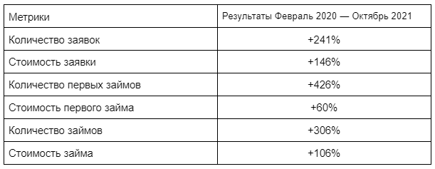 С февраля 2020-го по октябрь 2021-го рекламный бюджет увеличили в 8 раз. При этом займов стало больше в 5 раз. Стоимость выданного займа выросла всего в 1,6 раза, что укладывалось в экономику клиента.