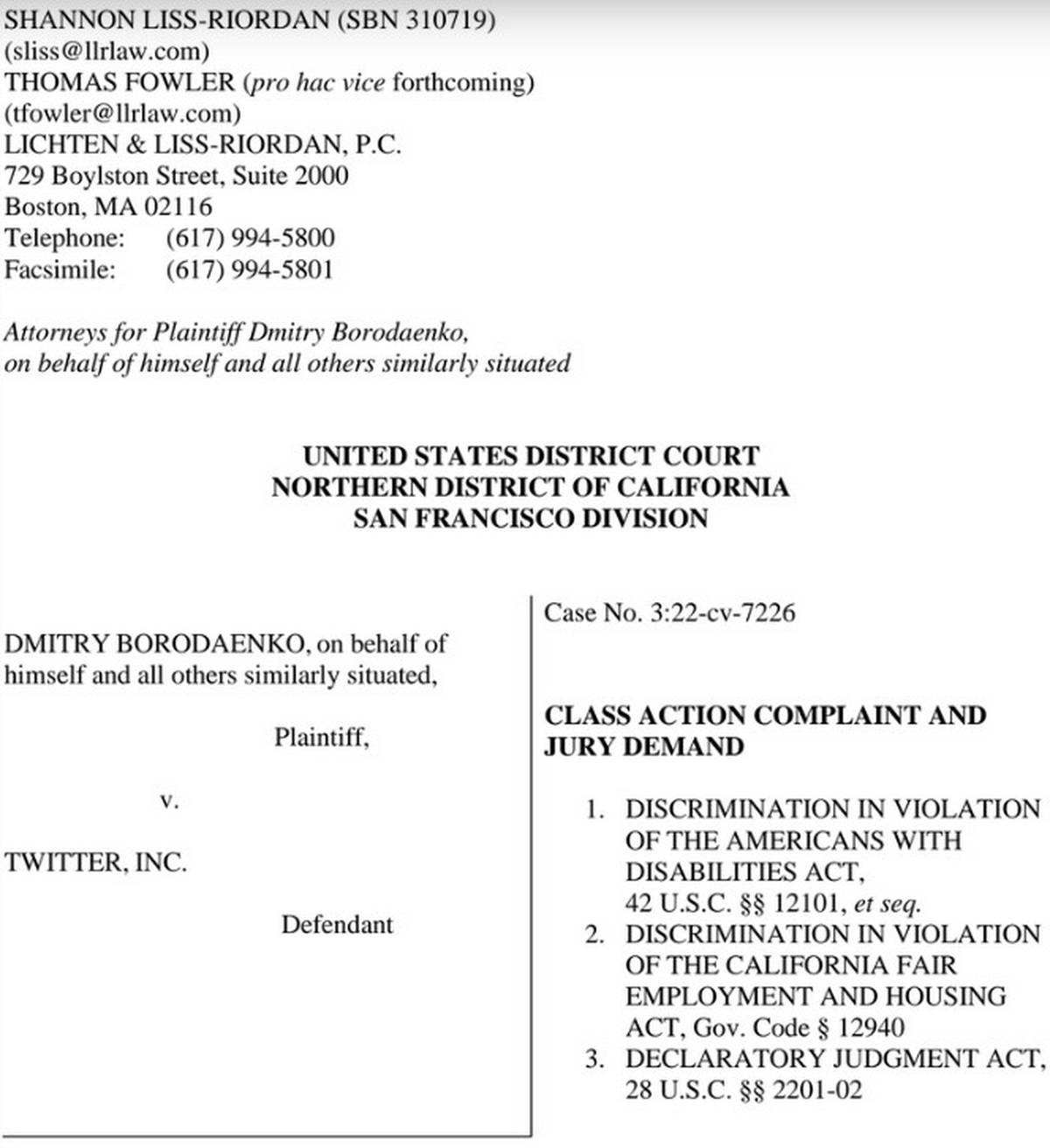 Инженер-менеджер из Калифорнии Дмитрий Бородаенко подал коллективный иск против Twitter в федеральный суд Сан-Франциско. Как пишет Reuters, он счел дискриминацией отмену Маском формата удалённой работы, а его увольнение из-за неявки в офис — неправомерным. Согласно жалобе, Бородаенко имеет инвалидность, которая делает его уязвимым перед COVID-19.