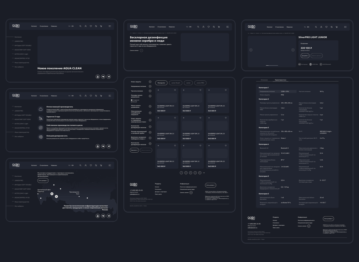 Главная страница получила тёмный фон для более выразительной подачи контента, а внутренние разделы — светлую, спокойную палитру для комфортной работы с каталогом и большими массивами информации.