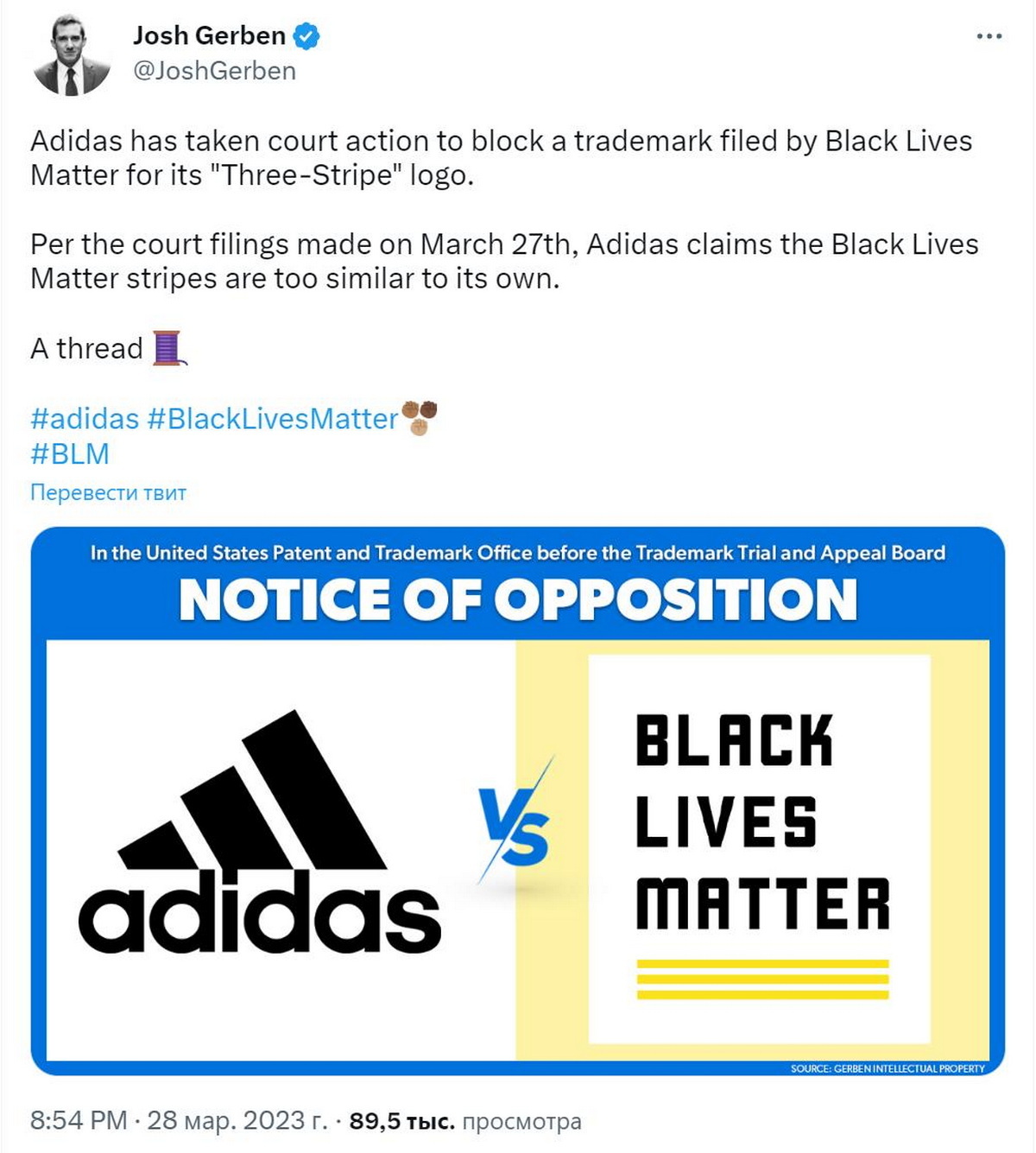 Компания Adidas обратилась в управление по товарным знакам США с просьбой отклонить заявку на товарный знак Black Lives Matter, утверждая, что это может ввести общественность в заблуждение. В своем заявлении, направленном регулятору в понедельник, Adidas сообщила, что дизайн с тремя параллельными желтыми полосками, разработанный Black Lives Matter Global Network Foundation Inc., слишком похож на её собственную знаменитую торговую марку. Также немецкий производитель спортивной одежды просит запретить фонду использовать этот логотип на товарах, которые есть и в ассортименте Adidas: рубашках, головных уборах и сумках.