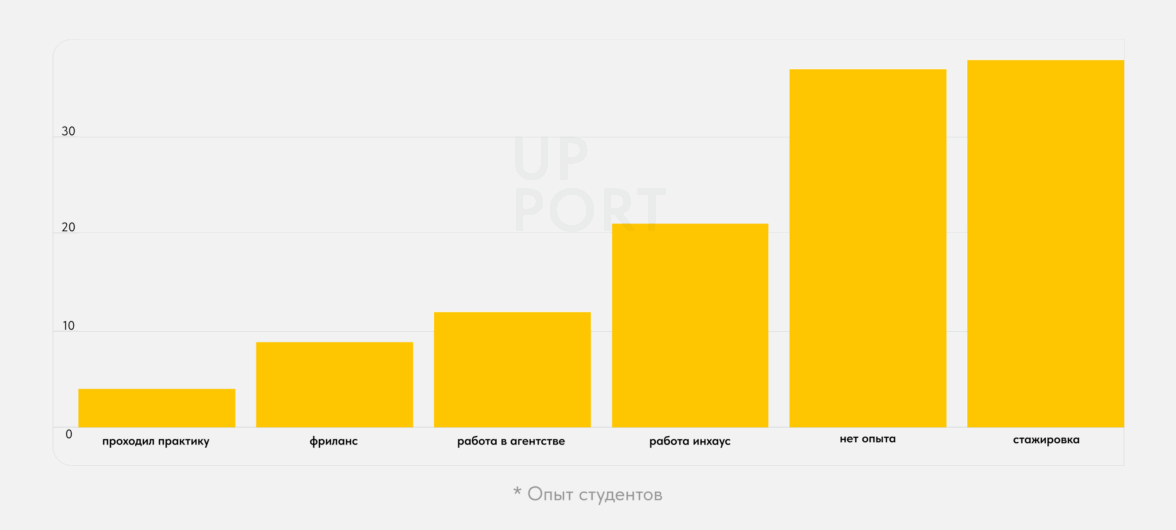 Исследование показало, что большинство студентов мотивированы и заинтересованы в карьере в индустрии, но часто не знают, как сделать первый шаг. У 38,5% уже есть профессиональный опыт — в основном это короткие стажировки или практика во время учебы. Лишь 10,9% работали в агентствах, а 37,5% не имели опыта вовсе. Именно у этой группы чаще всего возникают тревоги и сомнения относительно своего профессионального будущего.