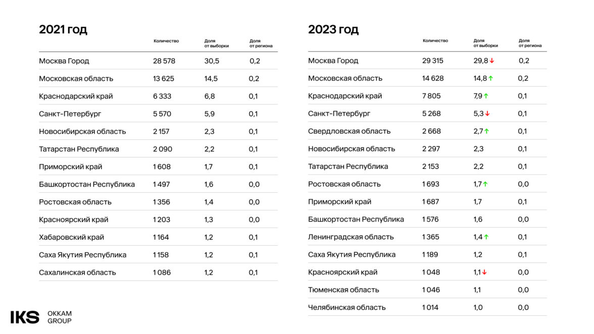 Приток высокодоходной аудитории наблюдается в Московской области (14,5% от выборки в 2021 году vs 14,8% в 2023 году), Краснодарском крае (6,8% vs 7,9%), Свердловской (2,3% vs 2,7%), Ростовской (1,4% vs 1,7%) и Ленинградской областях (1,2% vs 1,4%).