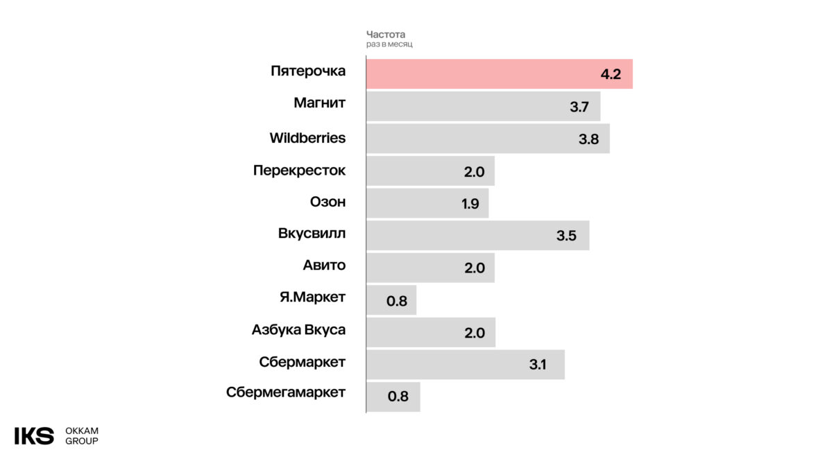 В топ-5 по тратам входят «Пятерочка», «Магнит» и «Перекресток» — в данном случае главным фактором для состоятельной аудитории является близость к дому или работе. Если учитывать e-com, то по частоте покупок в месяц лидируют «Пятерочка» (в среднем 4,2 раза в месяц), Wildberries (3,8), «Магнит» (3,7) и «Вкусвилл» (3,5).