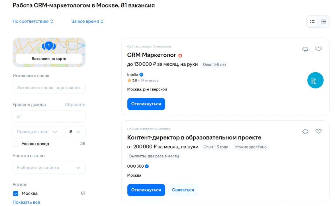 На ноябрь 2025 года по Москве была найдена всего 81 вакансия CRM-маркетолога