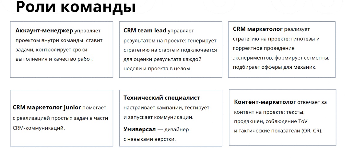 Обязанности распределены на конкретную группу сотрудников, где каждый играет свою роль. Стратег продумывает стратегию — разрабатывает сценарии, анализирует отчеты, интерпретирует результаты, контент-маркетолог руководит дизайнерами, верстальщиками, копирайтерами, технический специалист реализует сложные механики, динамические блоки, сложные сценарные настройки, опционально подключается аналитик. А объединяет эту историю для клиента аккаунт-менеджер.