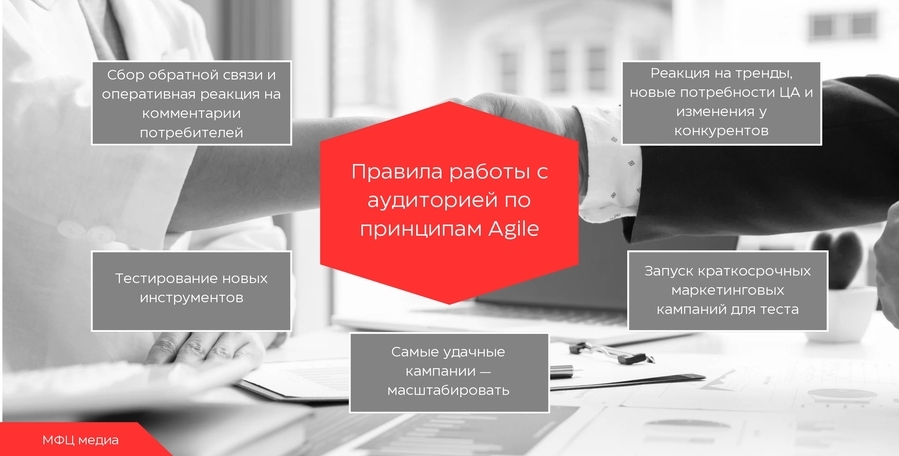 Именно agile-подход помогает подходить гибко, вносить изменения в текущие РК, принимать решения здесь и сейчас, тестировать и перенаправлять потоки из неработающих или неэффективных инструментов в другие каналы и форматы продвижения.