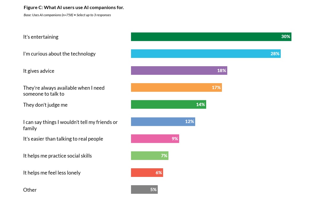 В среде американских подростков ИИ-компаньоны получили широкое распространение. Как показало проведенное организацией Common Sense Media исследование «Разговоры, доверие и компромиссы: как и почему подростки используют ИИ-компаньонов» (Talk, Trust, and Trade-Offs: How and Why Teens Use AI Companions), почти три четверти (72%) подростков в США хотя бы раз пользовались ИИ-компаньонами. Более половины опрошенных (52%) относятся к постоянным пользователям, то есть используют ИИ-компаньонов не реже нескольких раз в месяц. Самая частая модель использования — несколько раз в неделю — так поступает каждый пятый (21%). Хотя бы один раз в день делает это каждый двадцатый подросток (5%), несколько раз в день — один из двенадцати (8%). Никогда не пользовались ИИ-компаньонами только четверть (28%) подростков. Среди юношей таких чуть больше (31%), чем среди девушек (25%).