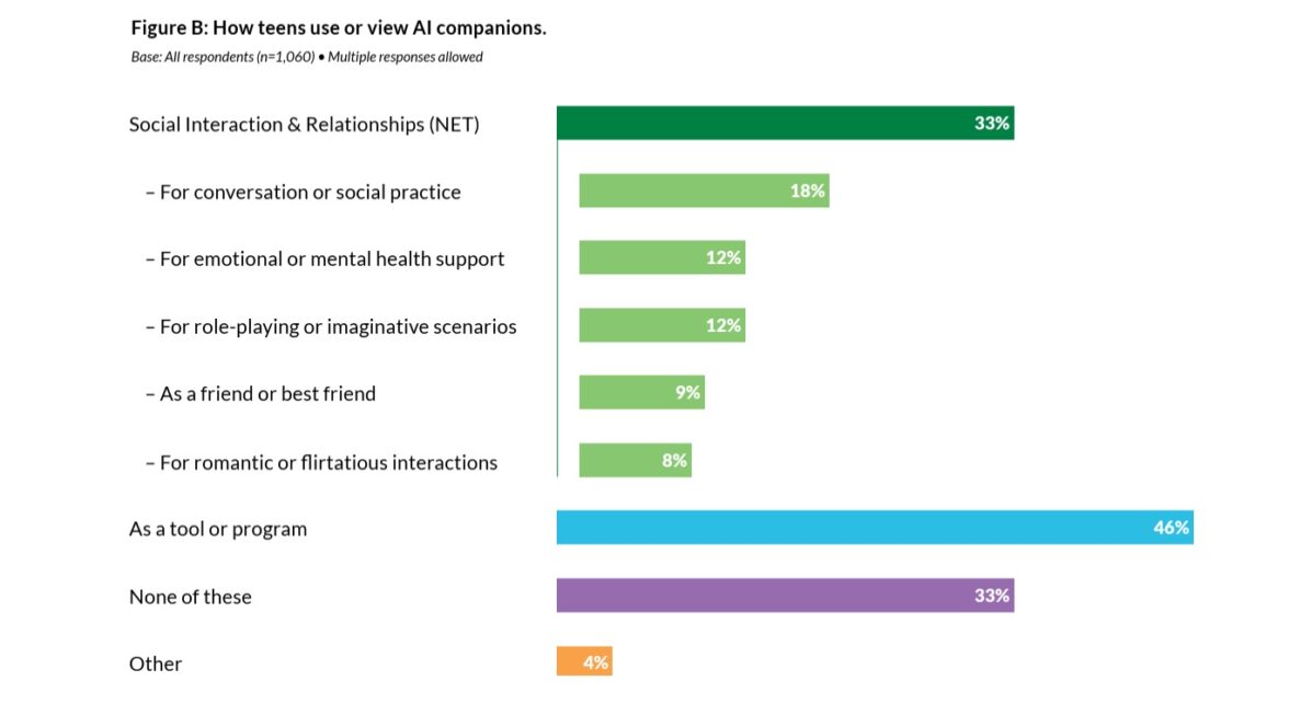 Треть американских подростков (33%) общается с ИИ-компаньонами или вступает с ними в дружеские или романтические отношения. Почти каждый пятый (18%) оттачивает на ИИ-компаньоне разговорные навыки, учится общаться. Один из восьми (12%) обращается к услугам чат-бота, когда у него эмоциональные проблемы или проблемы душевного здоровья. Такое же число опрошенных играет с ИИ-компаньонами в различные ролевые игры. Для 9% подростков чат-бот — друг или подруга, возможно, даже лучший друг или лучшая подруга. А у 8% участников исследования с ИИ-компаньонами был флирт или романтические отношения.