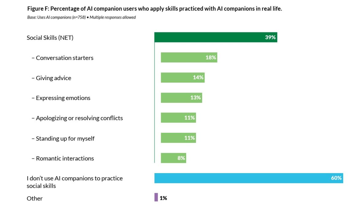 Четверым из десяти подростков (39%) разговорный чат-бот помог освоить какой-то навык, который затем был использован в общении с людьми. Большинство подростков (60%) так не поступали, 1% участников исследования не дали однозначного ответа на этот вопрос. Из числа тех подростков, для которых ИИ стал другом, 18% благодаря его помощи научились начинать разговор, 14% давали кому-то советы, 13% выражали эмоции, 11% научились извиняться или прекращать конфликт, стольких же ИИ-компаньон научил постоять за себя.