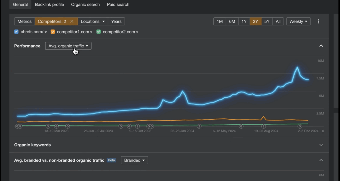 Рост или падение органического трафика по сайту в целом или по его разделам с горизонтом в несколько месяцев.