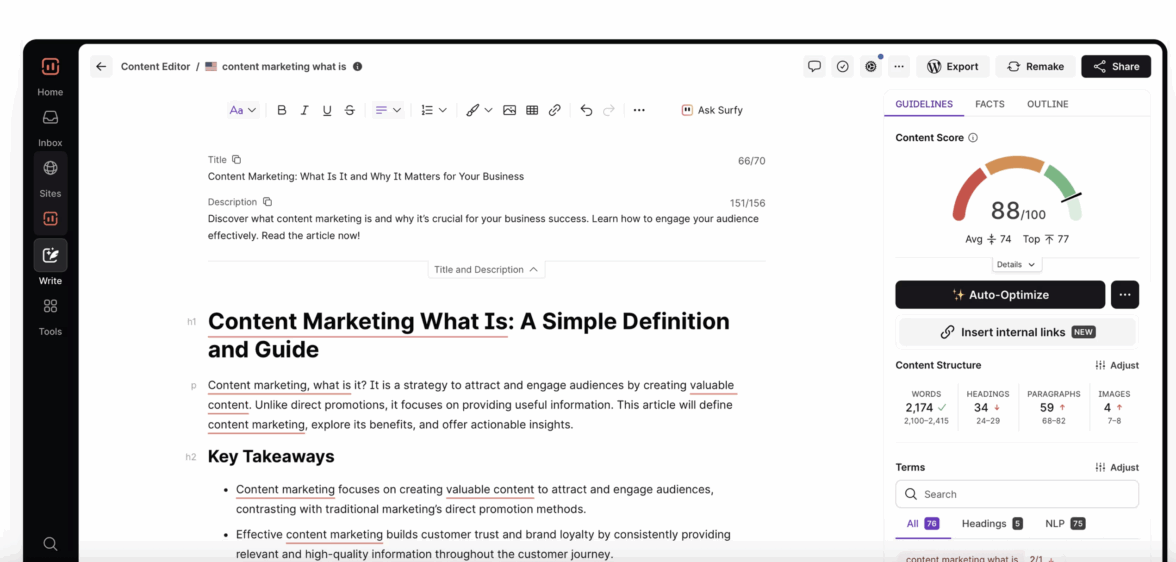 Платформа на основе ИИ для создания и оптимизации контента под поисковые системы и нейровыдачу. Кроме того, доступно создание SEO-брифов, структуры статей и анализ пользовательских интентов. Все эти функции ускоряют подготовку контента, а затем его можно тестировать в предиктивной модели.