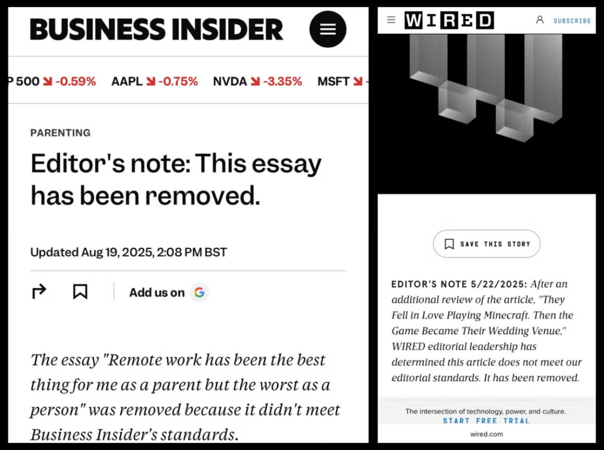 Сообщения об удалении ИИ-статей на сайтах Business Insider и Wired