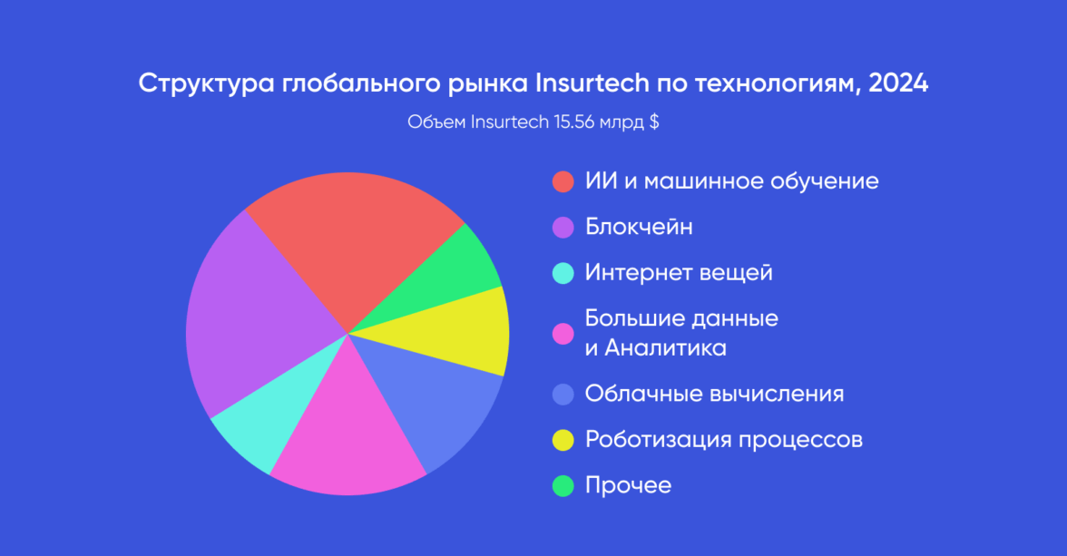 ИИ и машинное обучение занимают крупнейшую долю в Insurtech — около 24% от общего объема. По оценкам Market Research Future, в 2024 году мировой рынок ИИ-технологий для страхования оценивался в $7,17 млрд, а к 2025-му может вырасти до $11,12 млрд.