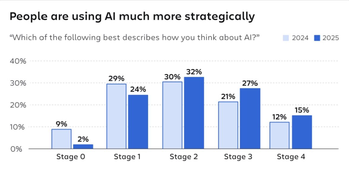 За год доля опрошенных, использующих ИИ ежедневно, почти удвоилась, а доля людей, считающих ИИ бесполезным, сократилась на 78%. При этом доля людей, которые видят в ИИ стратегического партнера, выросла на 27%.