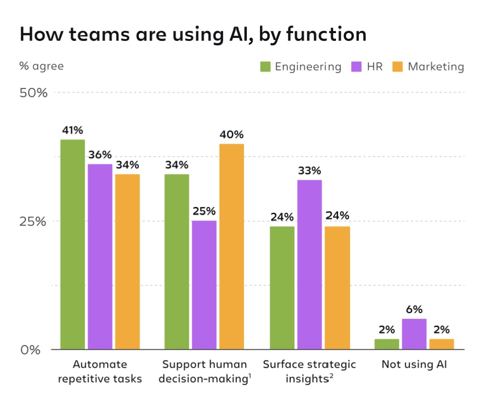 При этом менеджеры считают, что ИИ приносит большую пользу именно в их сфере деятельности, а не в других. Так, 82% топ-менеджеров, занимающихся маркетингом, считают, что ИИ им очень помогает. Только 26% топ-менеджеров, занимающихся HR, и 20% руководителей технологических направлений думают, что ИИ — хороший помощник в маркетинге.