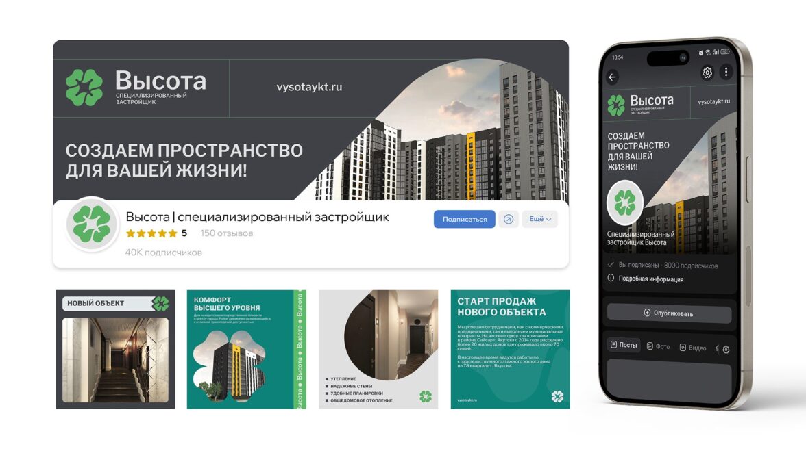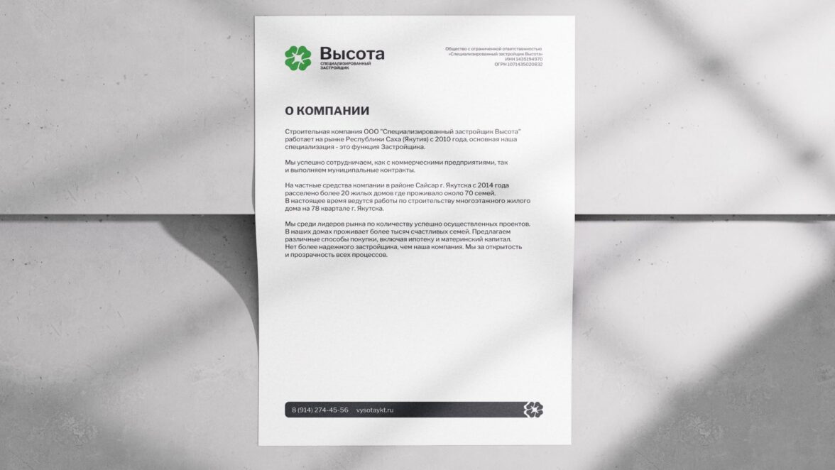 «Высота» — крупнейший застройщик Якутска, десять лет создающий новые кварталы и формирующий современную городскую среду. Компания росла, но визуальный стиль не успевал за ней. Старый логотип был собран в стандартном конструкторе и не имел идеи или концепции, а остальные элементы добавлялись на ходу и не имели общей системы.