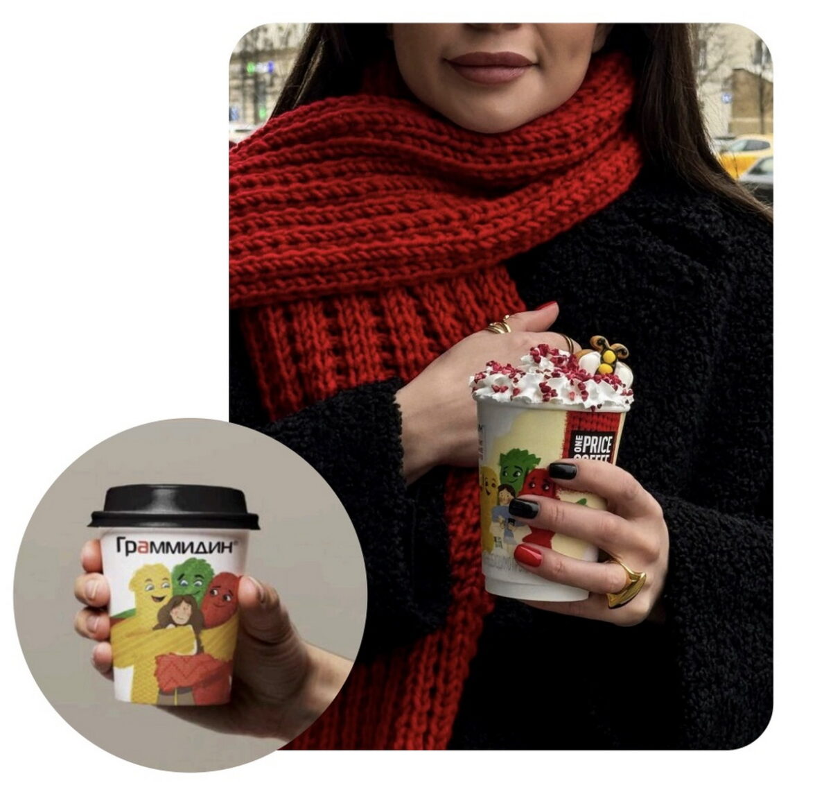 Фарм-бренды все активнее заимствуют успешные механики из FMCG и ритейла, чтобы выйти в повседневный контекст жизни потребителя. В рамках ко-промо кампании бренда «Граммидин» с сетью кофеен One Price Coffee «Согрейся со вкусом», которую реализовало агентство Starlink, в кофейнях сети в городах-миллионниках продавался авторский малиново-медовыйлатте. Он получил название «Ханни-латте малина»и подавался в красочном стаканчике с изображениемтеплых шарфов — фирменных атрибутов «Граммидин». Так выстраивалась новая эмоциональная связь с аудиторией. Клиент оценил нестандартный подход и полученный PR эффект.
