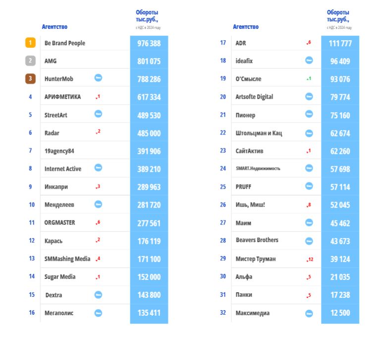 В первую тройку уральских агентств по финансовым показателям вошли компании Be Brand People с оборотом 976 млн рублей в 2024 году, AMG с 801 млн рублей и HunterMob с 788 млн рублей.