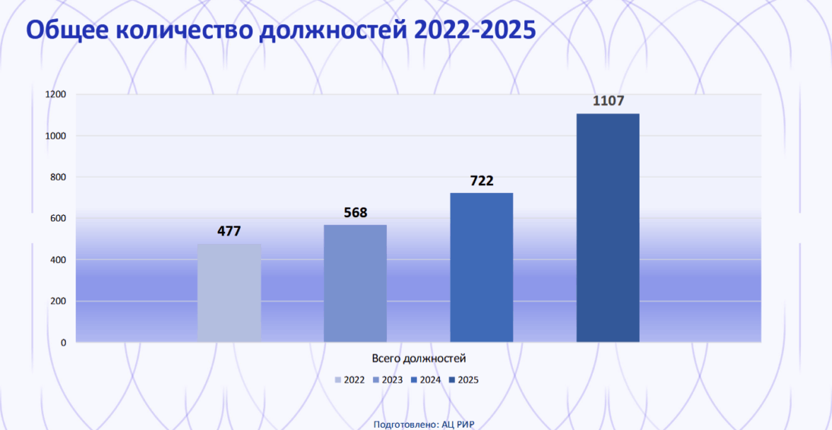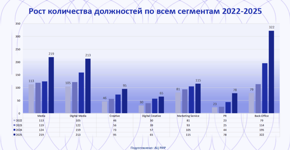 Совокупное число должностей во всех сегментах рекламного рынка достигло 1107 в 2025 году. Это на 53% больше, чем в 2024-м. За три года, с 2022-го по 2025-й, количество должностей увеличилось на 632 (+132% к 2022 году).