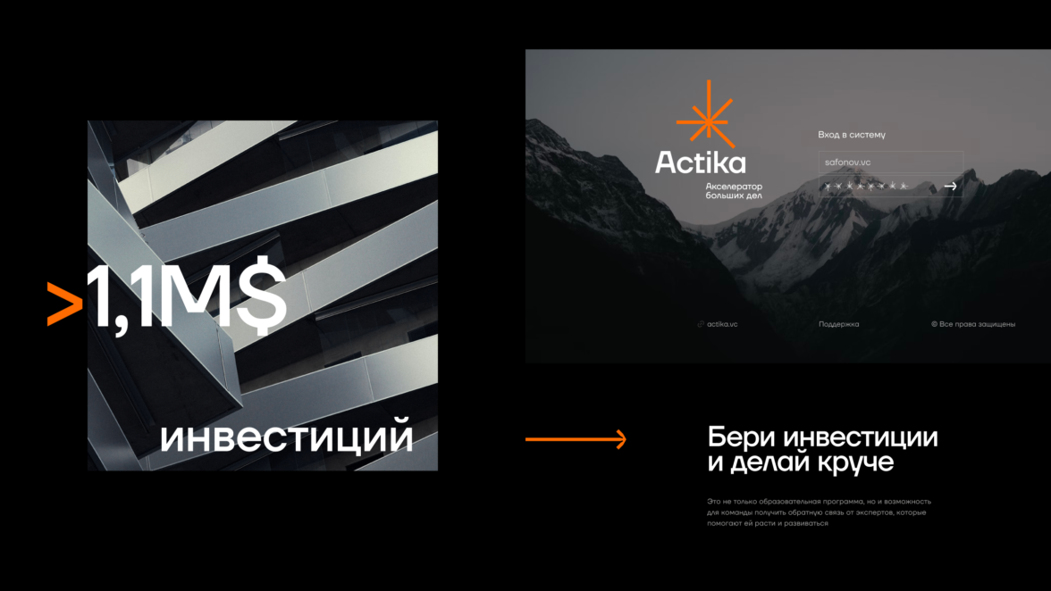 Предприниматели Евгений Лебедев и Антон Долгов, основавшие Actika, обратились в Sensesay с задачей разработать бренд акселератора, который бы помог коммуницировать целевой аудитории его главные ценности.