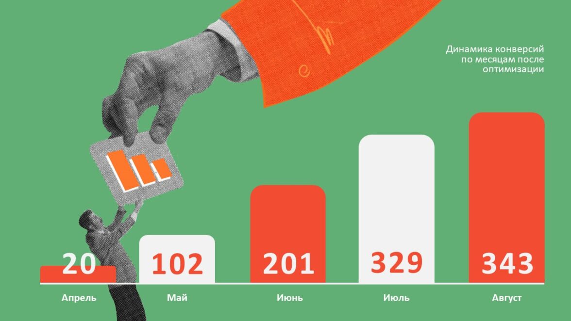 С момента старта рекламной кампании по результатам ежедневно проводимой оптимизации в первый месяц удалось существенно увеличить количество конверсий.