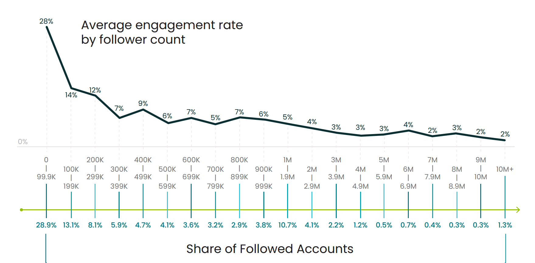 Максимальный уровень вовлеченности — у аккаунтов, имеющих до 100 тыс. подписчиков, следует из отчета Conviva. По достижении этой планки наступает резкий перелом: количество лайков, репостов и комментариев на видео снижается практически вдвое, а затем продолжает постепенно сокращаться по мере увеличения аудитории. Показатели вовлеченности у аккаунтов, на которые подписаны более 10 млн пользователей, не превышает 2%.