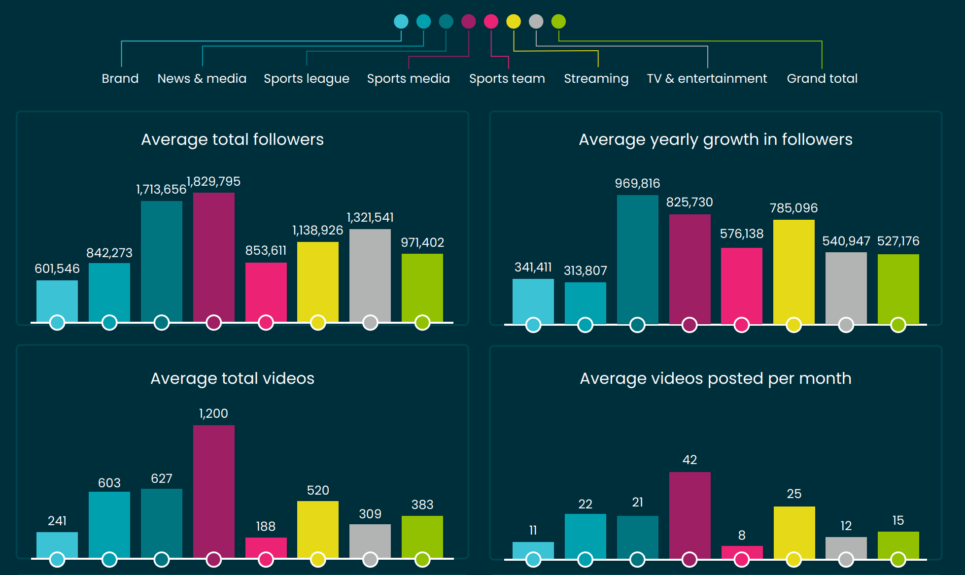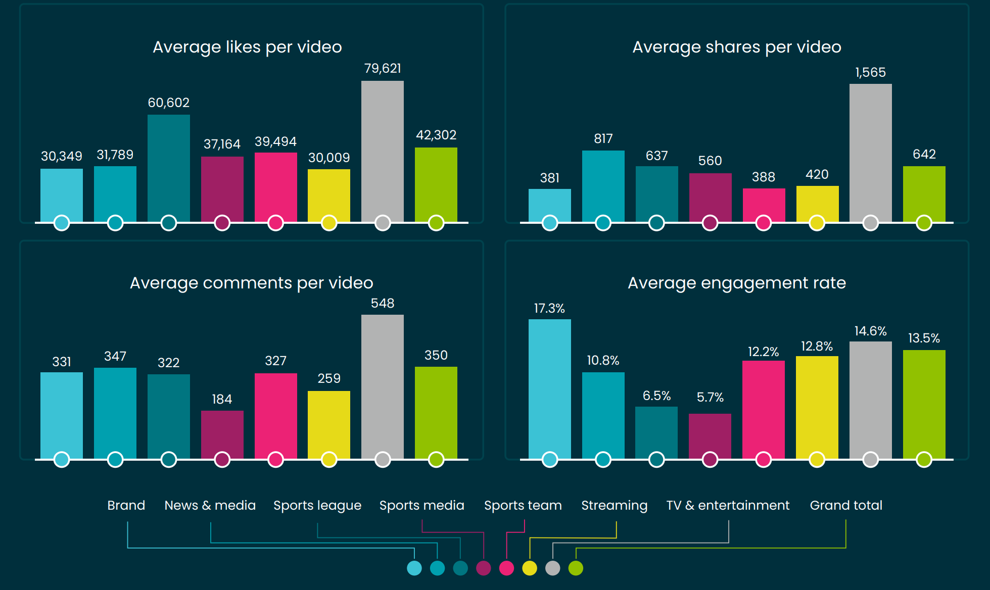 Эта взаимосвязь может объяснять относительно низкие темпы прироста аудитории брендов в TikTok. Именно бизнес-аккаунты публикуют меньше всего роликов в месяц. В среднем это всего 11 видео. Лидерами по объему публикуемого контента являются спортивные медиа, которые размещают новые публикации в четыре раза чаще.