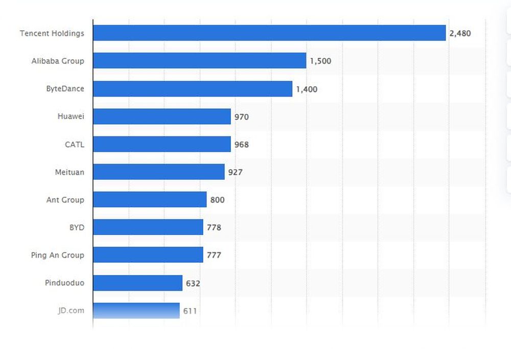 Выручка Tencent Holdings в 2022 году уменьшилась на 1% до $79,6 млрд, чистая прибыль упала на 16% до $27 млрд. Капитализация Tencent сейчас составляет $405 млрд.