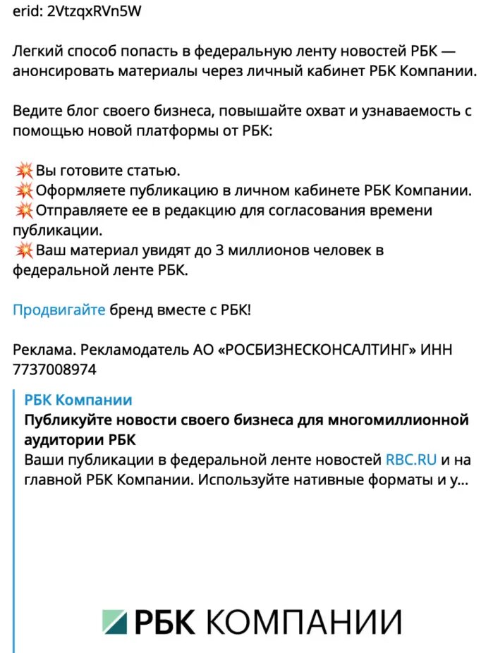 Телеграм. Рекламодателю важно корректно указать токен, чтобы не получить штраф. Когда пишете токен, используйте его полное наименование с ERID-идентификатором, цифрами и буквами, иначе реклама будет считаться не маркированной.
