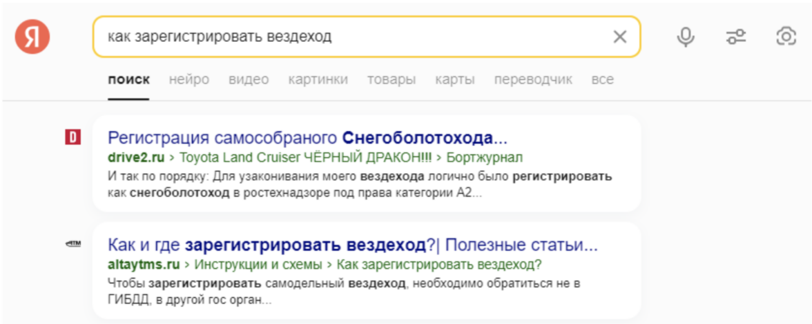 Поисковая выдача Яндекса по запросу «как зарегистрировать вездеход»