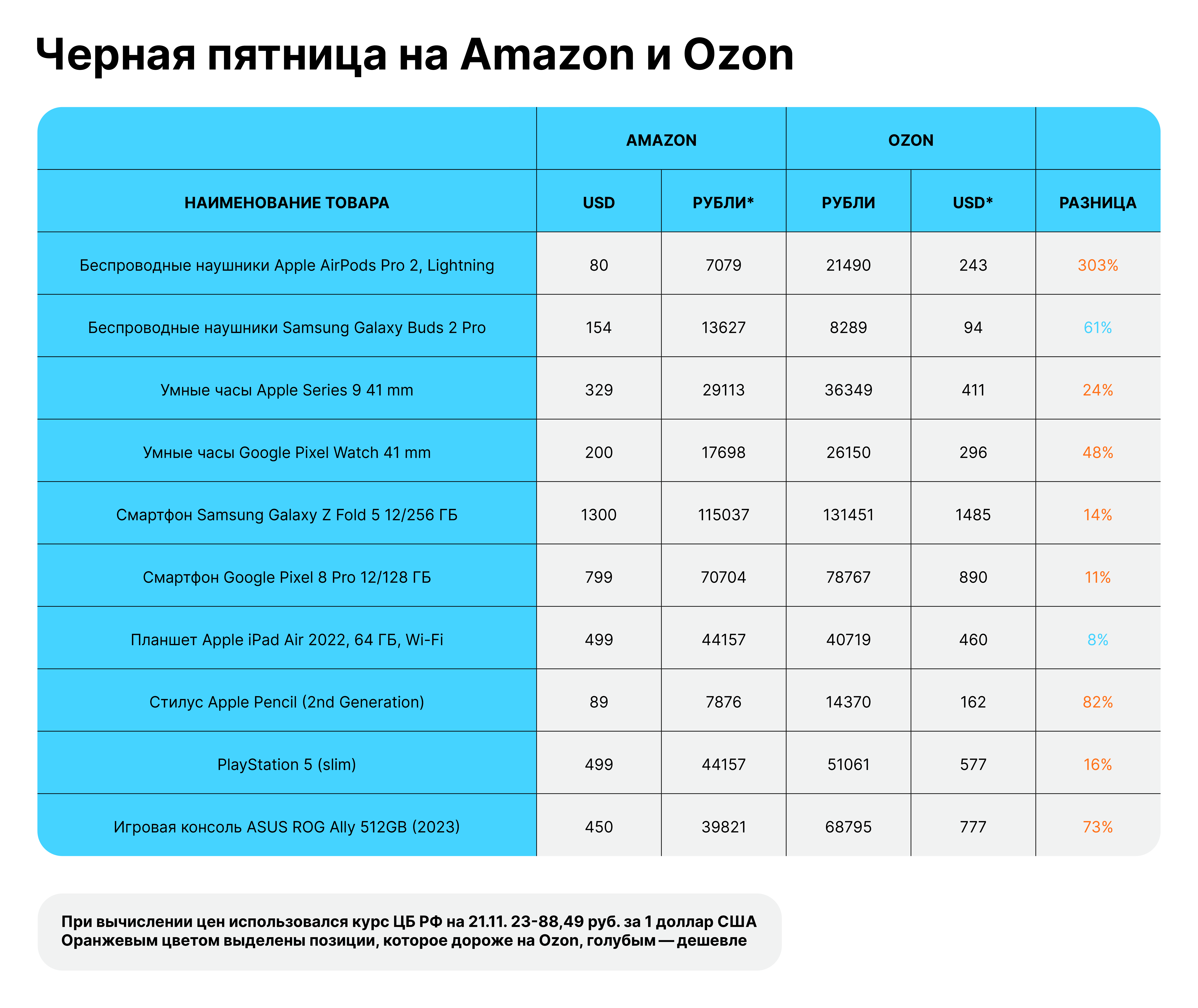 ADPASS сравнил скидки в отечественных и американских интернет-магазинах в «черную пятницу». На маркетплейсе Amazon электронику в этом году можно купить дешевле на 18-43%. Продавцы на российском Ozone завлекают покупателей сообщениями о скидках, но их размеры предпочитают не уточнять. Тем не менее, два из десяти популярных дивайсов в списке ADPASS на Ozon можно купить дешевле, чем в американском интернет-магазине.