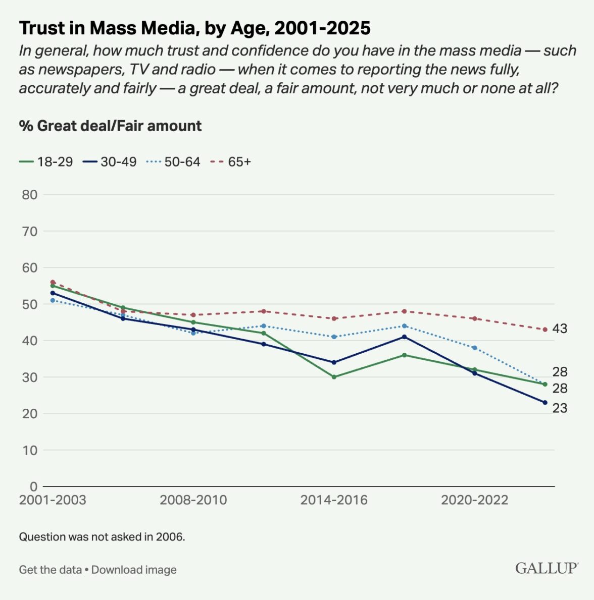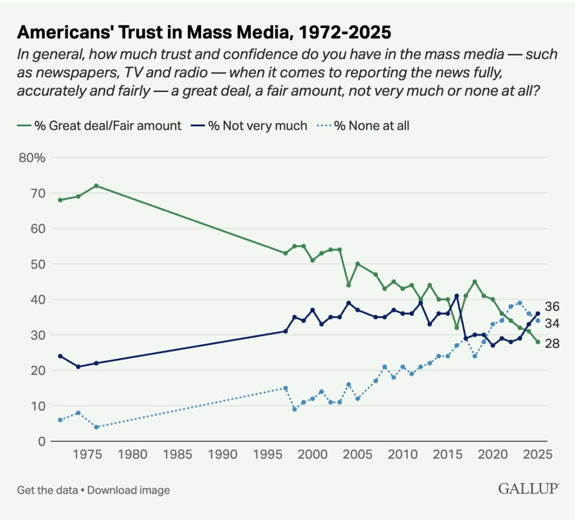 За минувшие полвека уровень доверия жителей США средствам массовой информации катастрофически упал. В 2025 году он достин нового минимума, как показывают результаты опроса, опубликованные Институтом Гэллапа. В настоящее время жители США, полностью доверяющие или достаточно доверяющие СМИ, находятся в явном меньшинстве. Их — 28%. Этот показатель уверенно снижается, начиная с 2018 года, когда он составлял 40%. Предыдущий антирекорд — 32% в 2016 году, но сейчас дно уверенно пробито. Сейчас в это сложно поверить, но еще в 2005 году СМИ верили ровно половина американцев (50%), а в 1976 году — почти три четверти (72%).