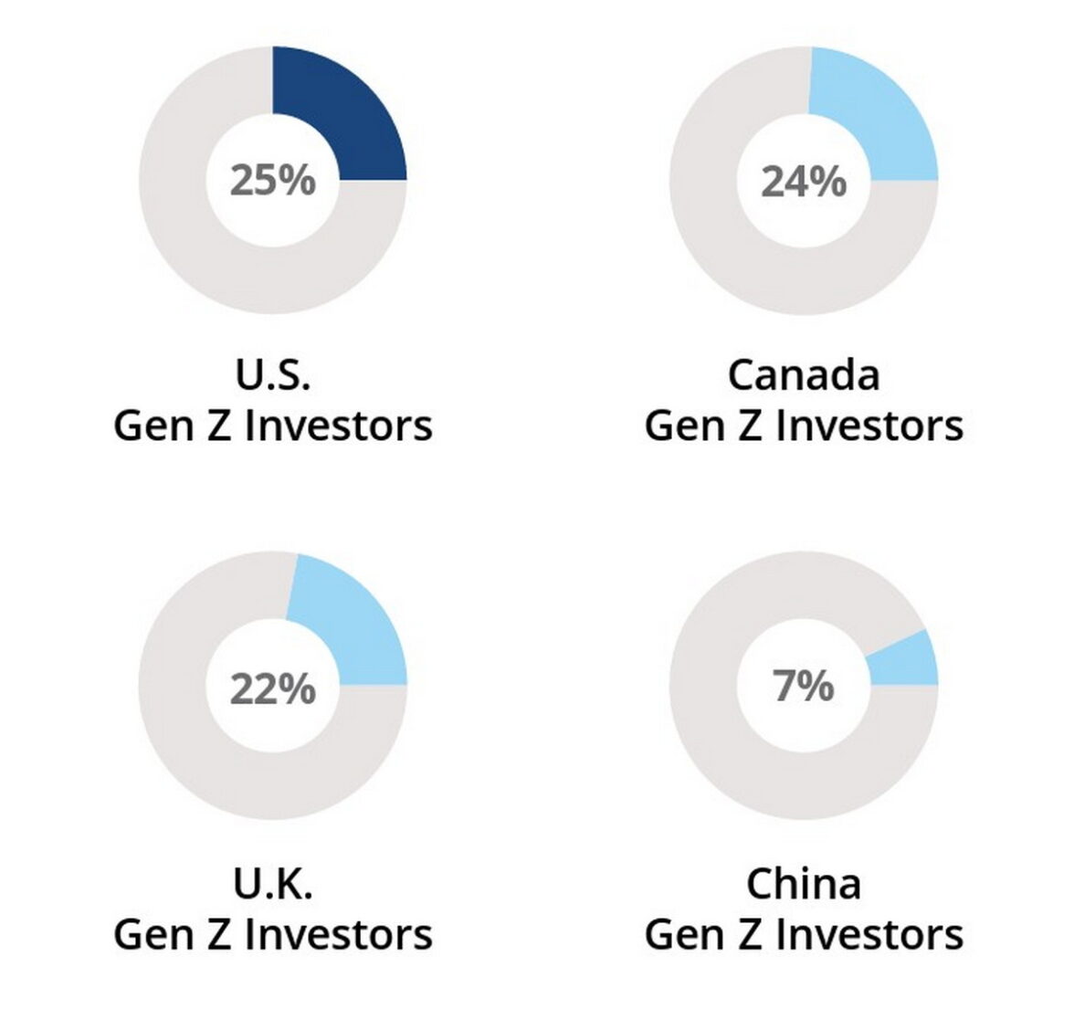 Американские зумеры начали инвестировать в молодом возрасте. Четверть из них (25%) до успели вложить свои деньги до достижения 18-летнего возраста. Интересно, что начало инвестиций в раннем возрасте является распространенной практикой не только в США, но также в Канаде (24%) и Великобритании (22%). В отличие от них лишь 7% китайских зумеров начали инвестировать до достижения ими совершеннолетия.