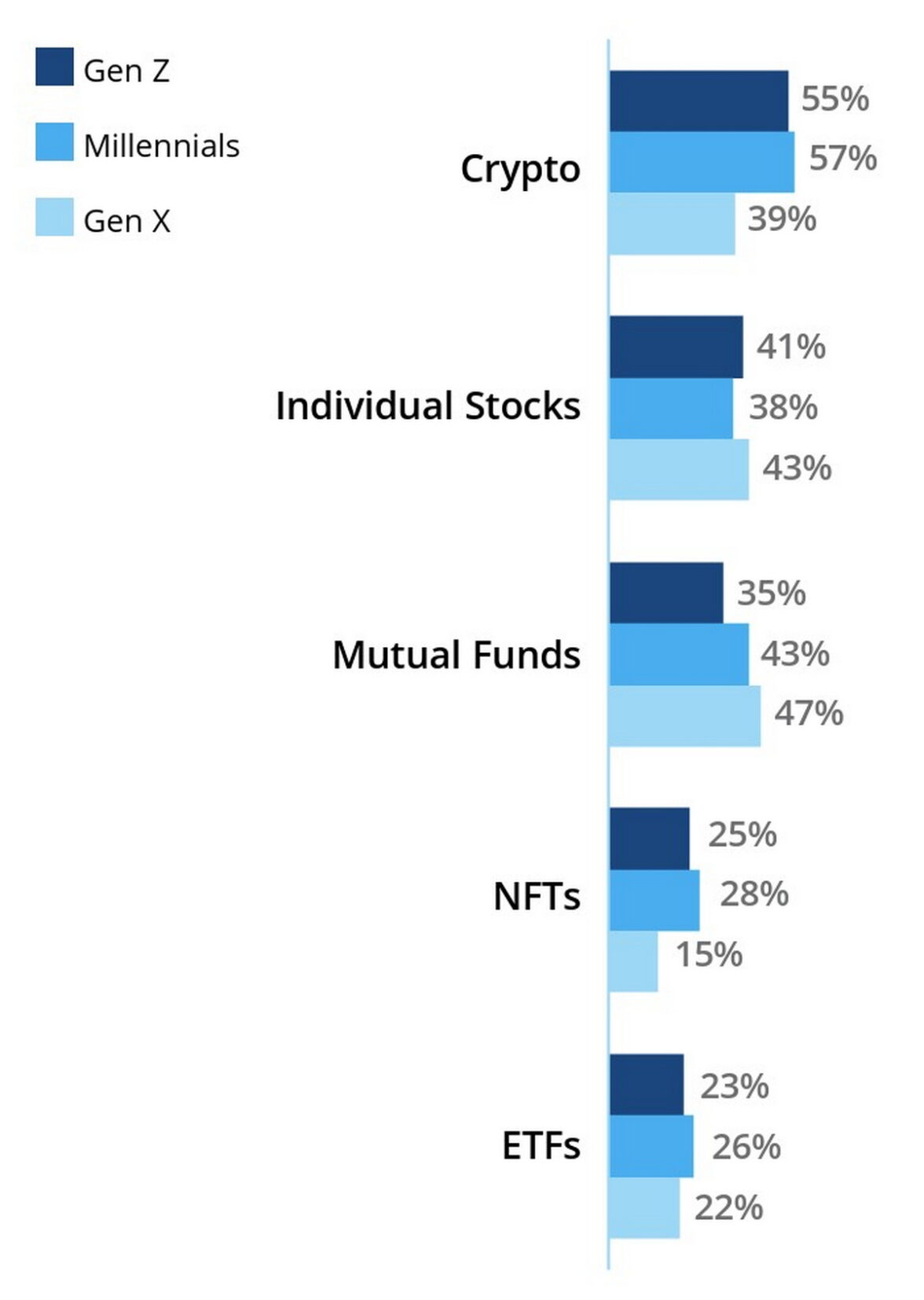 Согласно исследованию CFA Institute, большинство молодых американцев уже инвестируют. Больше половины респондентов (56%) рассказали, что владеют хотя бы несколькими инвестиционными инструментами. При этом 55% опрошенных инвестируют в криптовалюту, 41% — в акции, а 35% — доверяют деньги взаимным фондам (инвестиционные инструмент, который объединяют деньги нескольких инвесторов для покупки диверсифицированного портфеля активов, таких как акции, облигации или другие ценные бумаги). На четвертом месте по популярности у зумеров-инвесторов (25%) идут невзаимозаменяемые токены (NFT), на пятом — классические инвестиционные фонды (23%).