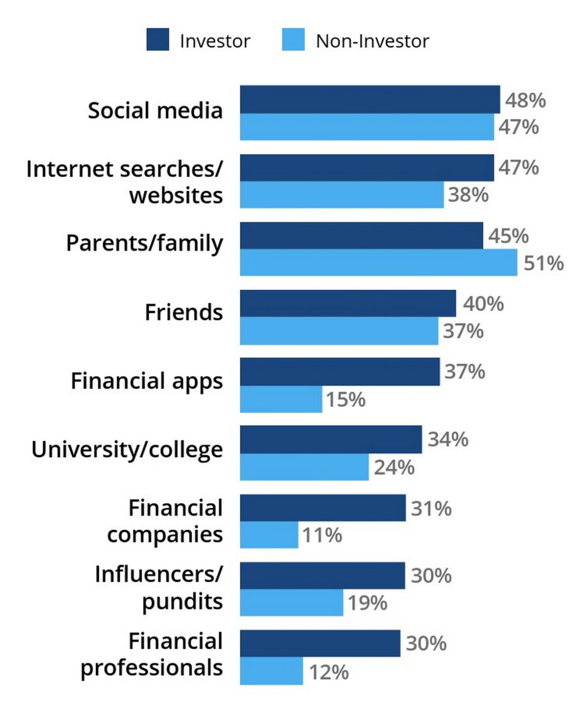 Инвесторы поколения Z используют различные ресурсы для изучения вопросов финансов, среди которых преобладают онлайн-источники и личные связи. Главный из них — соцсети, где ищут необходимую информацию 48% респондентов. Далее идут: поиск в интернете (47%), родители/семья (45%) и друзья (40%).