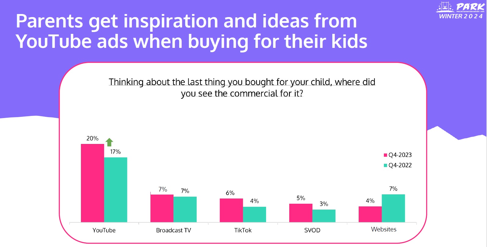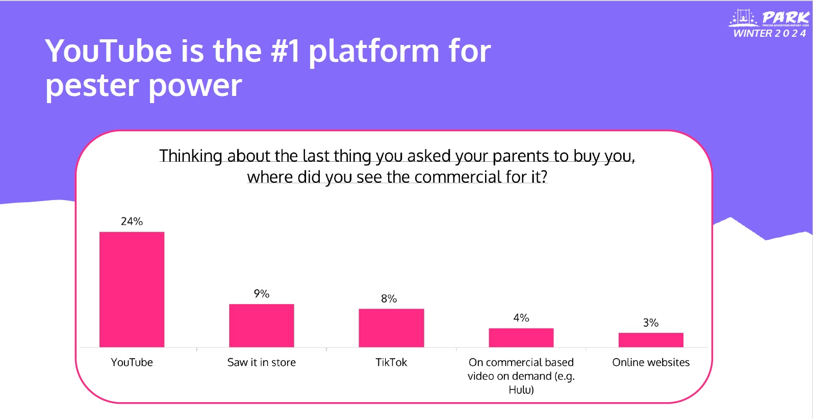 Вы еще не устали от доказательств величия YouTube? Вот вам еще одно. Вопрос звучит так: «Когда вы в последний раз просили родителей что-то вам купить, где вы увидели рекламу этого?». 24% опрошенных видели ее на YouTube. 9% в магазине, 8% в TikTok.