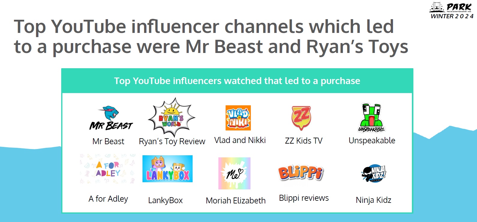 Какая именно реклама сыграла свою роль? Согласно ответам родителей, в 20-21% случаев это была реклама в YouTube. В 7% случаев – в эфирном ТВ (все-таки родители явно не хотят отказываться от привычки к этому старинному методу потребления контента), в 6% случаев – на TikTok, в 5% случаев – в подписном видео по запросу, в 4% случаев – на сайтах. Но, судя по этим цифрам, большинство родителей – 58% – другим образом догадываются, что же можно купить своему ребенку. Каким? В первую очередь им говорит ребенок (возможно, также после просмотра рекламы). Второй по популярности вариант – родитель увидел что-то в магазине. Реклама в YouTube – на третьем месте. Довольно распространенные варианты также – подсказки со стороны родственников или друзей. Но, видимо, у современных родителей не так много родни и друзей, так что 40% узнают о новых товарах от инфлюенсеров. Лучший советчик из их числа – мистер Бист.