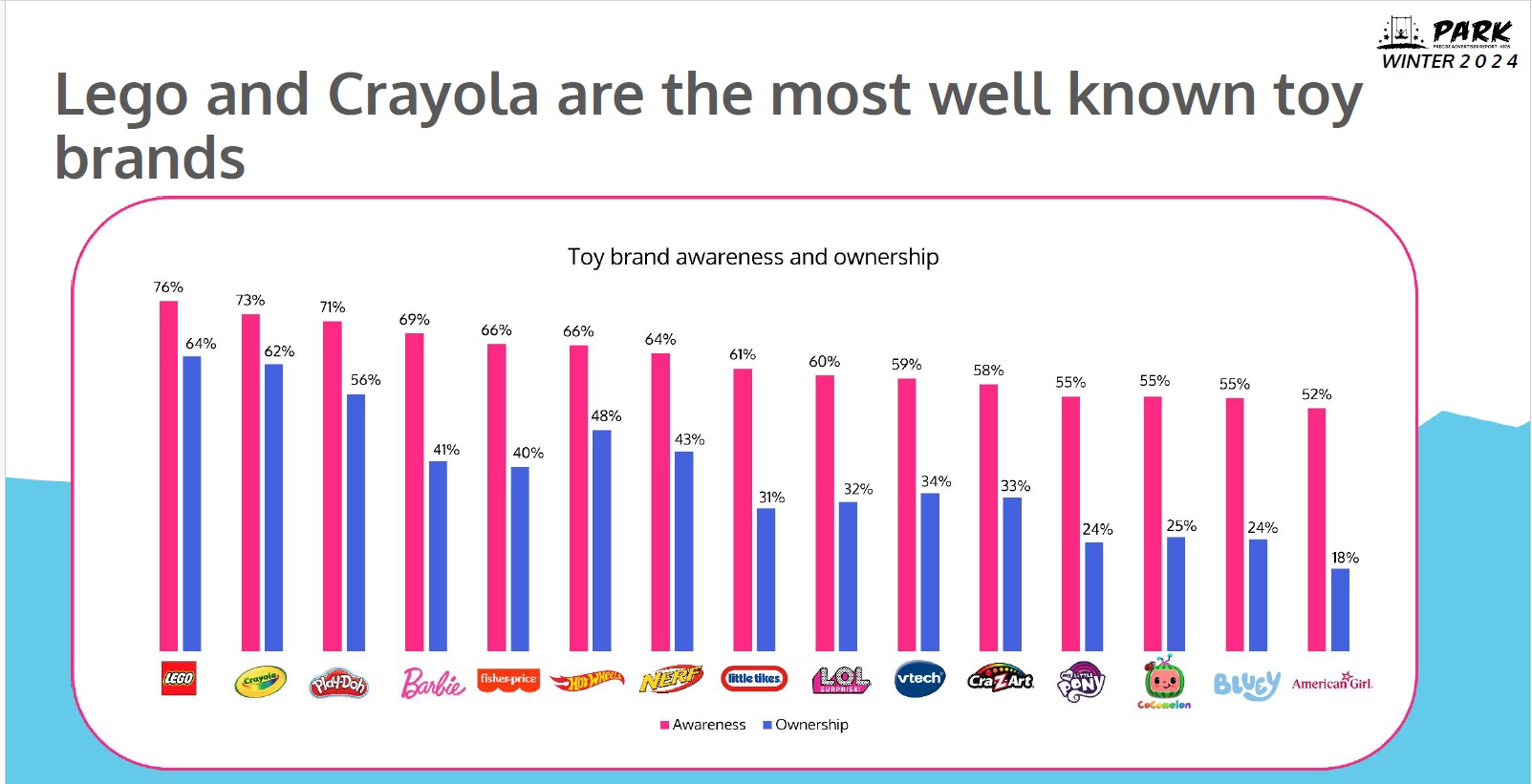 Вероятно, мощное присутствие Lego в виртуальном мире делает его самым узнаваемым и самым покупаемым «детским» брендом. На втором месте по узнаваемости-покупаемости – Crayola. В первую пятерку также попали Play Doh, Barbie и Fisher Price.