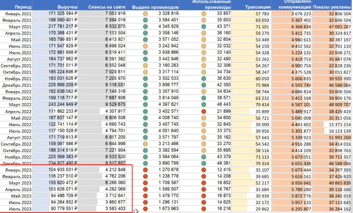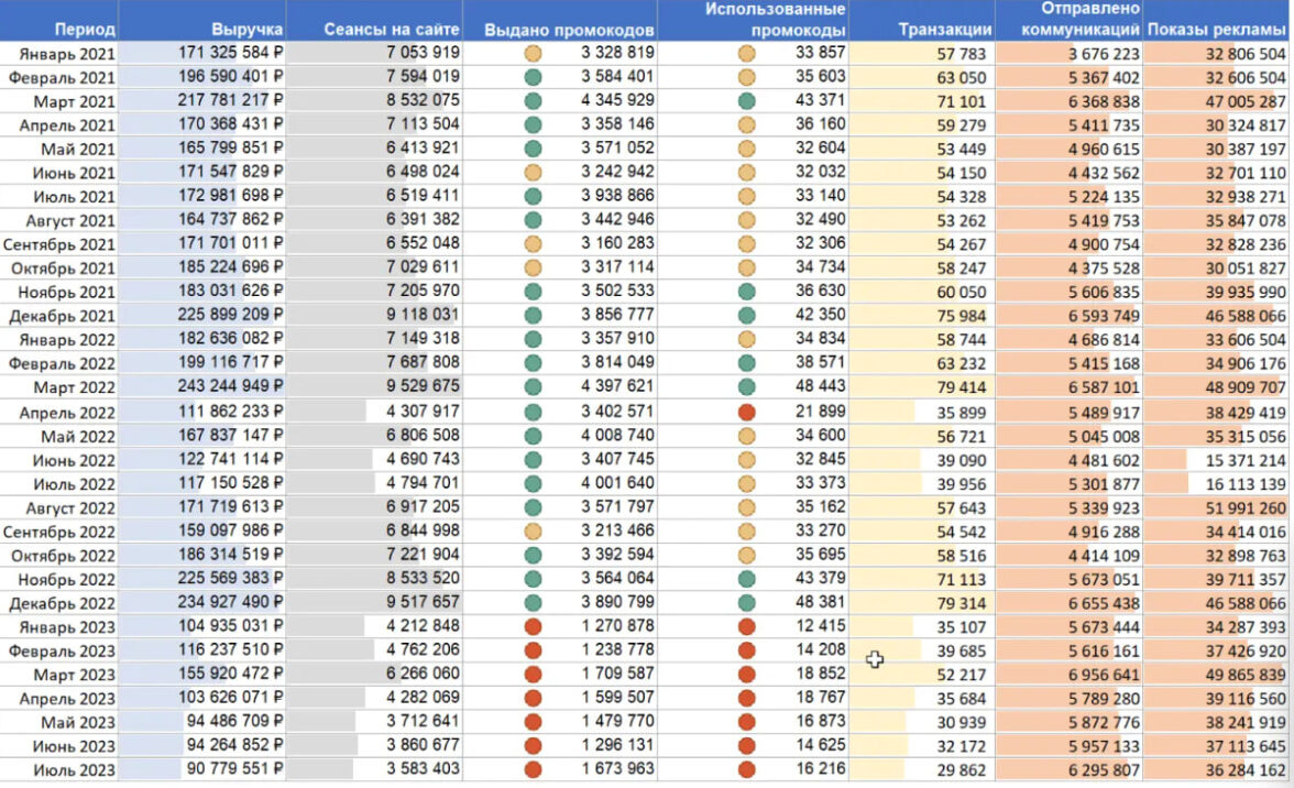 Очевидные периоды падения показателей в таблице