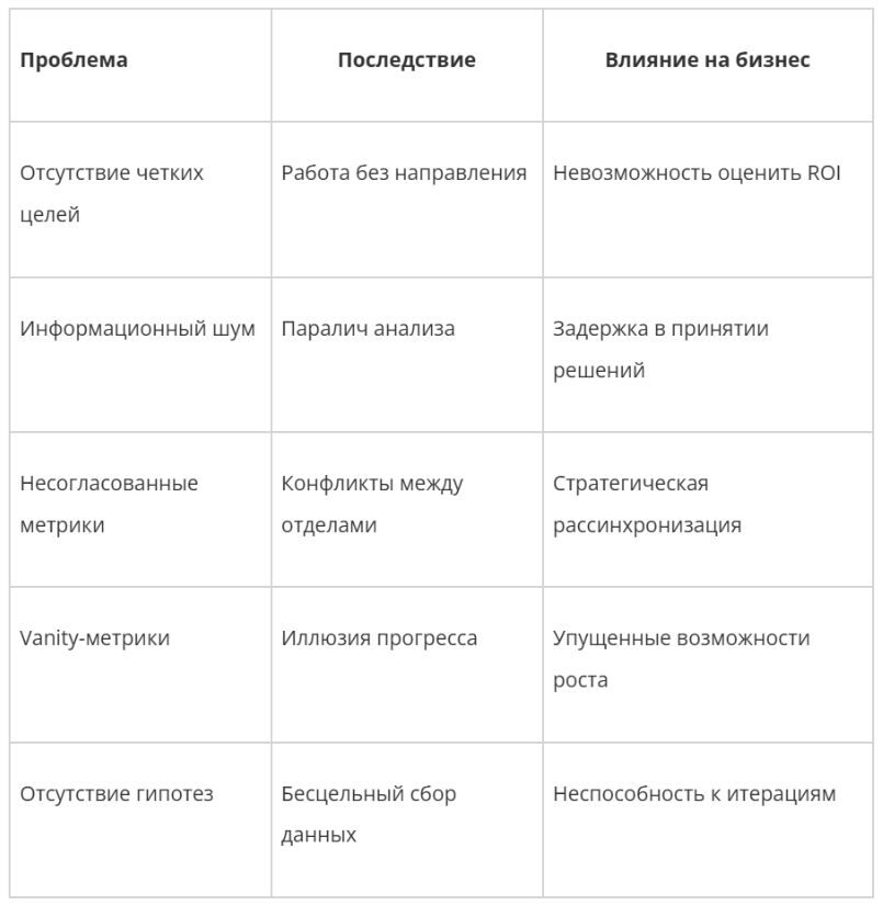 Отсутствие четких целей и KPI — пожалуй, самая распространенная проблема. Команды часто начинают с размытого запроса «нам нужна аналитика», не определив конкретных бизнес-целей и метрик успеха. Без четкого понимания того, что именно нужно измерять и зачем, любая аналитическая система обречена на провал.