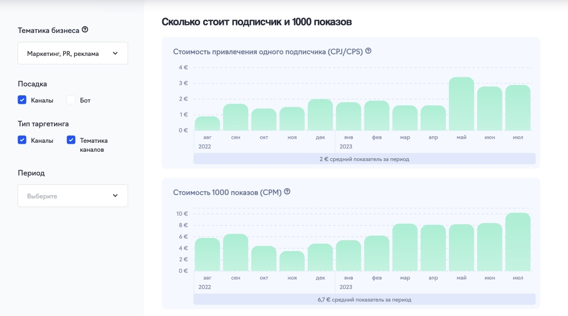 среднюю цену подписчика и тысячи показов;