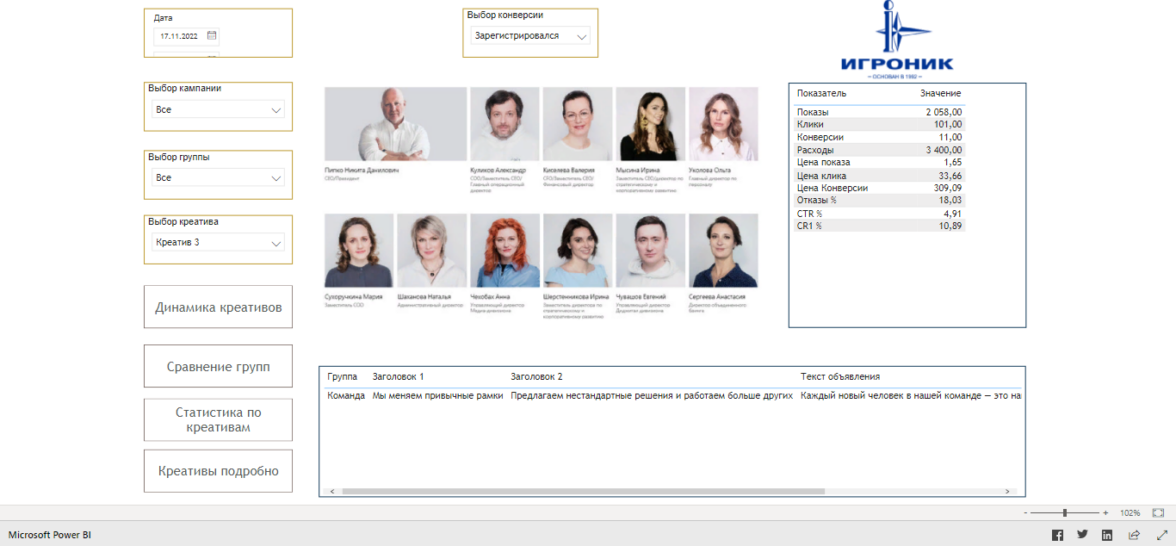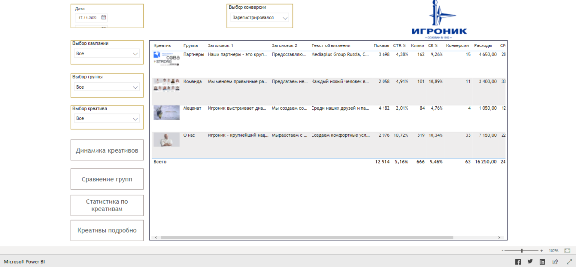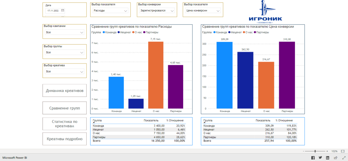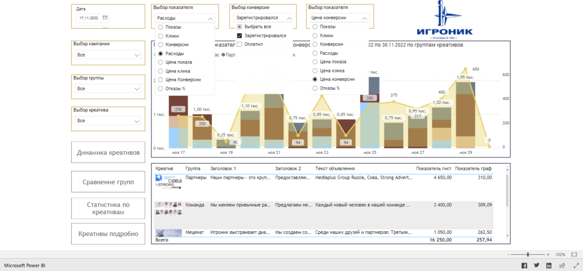Данные, полученные после объединения, позволяют построить серию отчетов с использованием разнообразных срезов и фильтров. Например, в нашем отчете мы можем выбрать из выпадающего списка 2 показателя и сравнить их изменение в динамике. Также на уровне всего отчета есть возможность выбора конкретной цели и фильтрации данных по номеру и названию рекламной кампании, а также по названию группы и креатива.