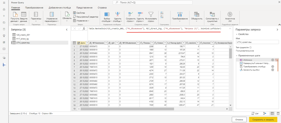 В результате получается таблица с показателями по дням из таблицы «Яндекс. Директ» и названием креативов из таблицы «Яндекс. Метрика».