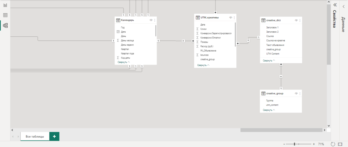 Загружаем все таблицы в PBI и устанавливаем между ними связь:
