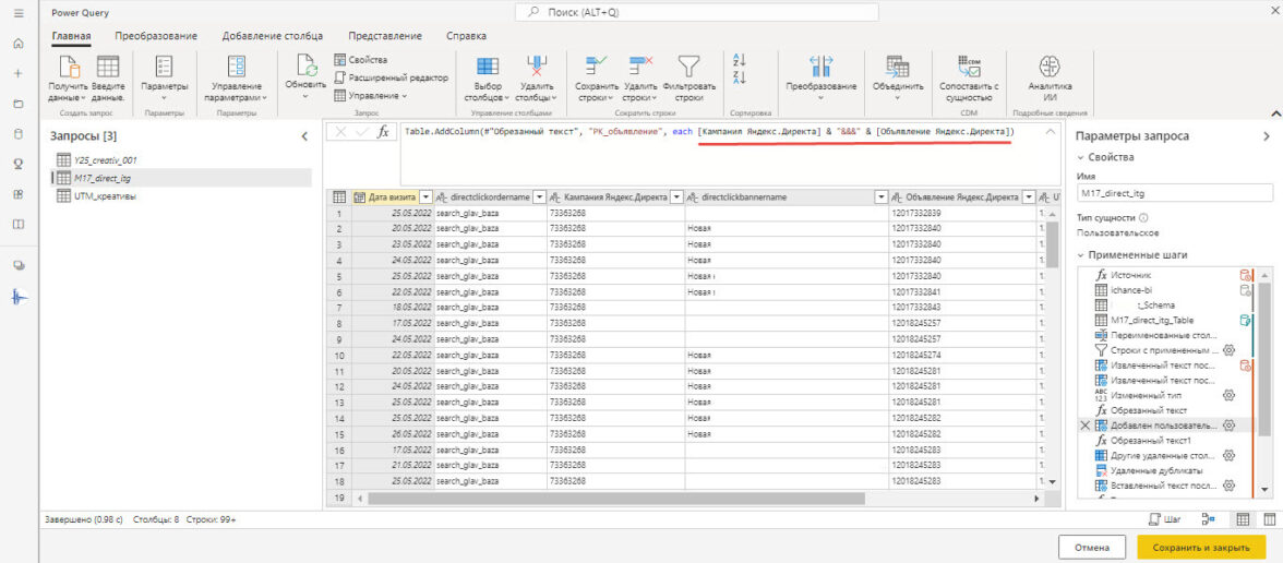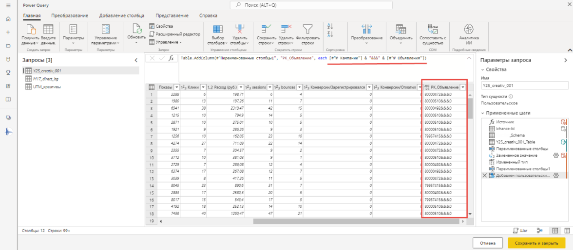 Создаем общий ключ объединения — в таблице «Яндекс. Директ» делаем пользовательский столбец, в котором объединяем номер рекламной кампании с номером объявления через специальный символ.