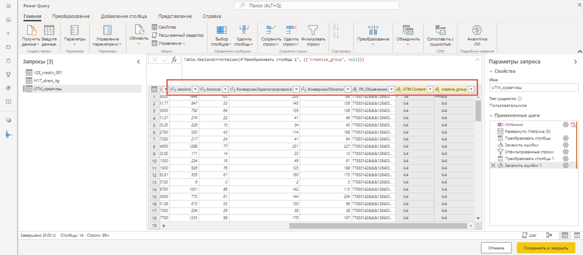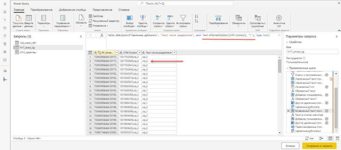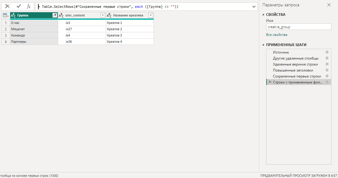Перед запуском рекламной кампании очень важно определить регламент разметки объявлений UTM-метками — это одно из основных условий корректной работы отчета. В нашем случае название креатива передается в utm_content на второй позиции после разделителя |. Забираем нужную нам часть из метки и удаляем дубликаты.