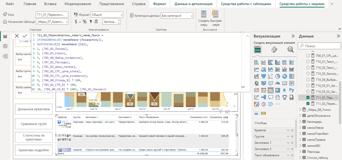 «Справочник креативов» фильтрует объединенную таблицу «Директ-Метрика».