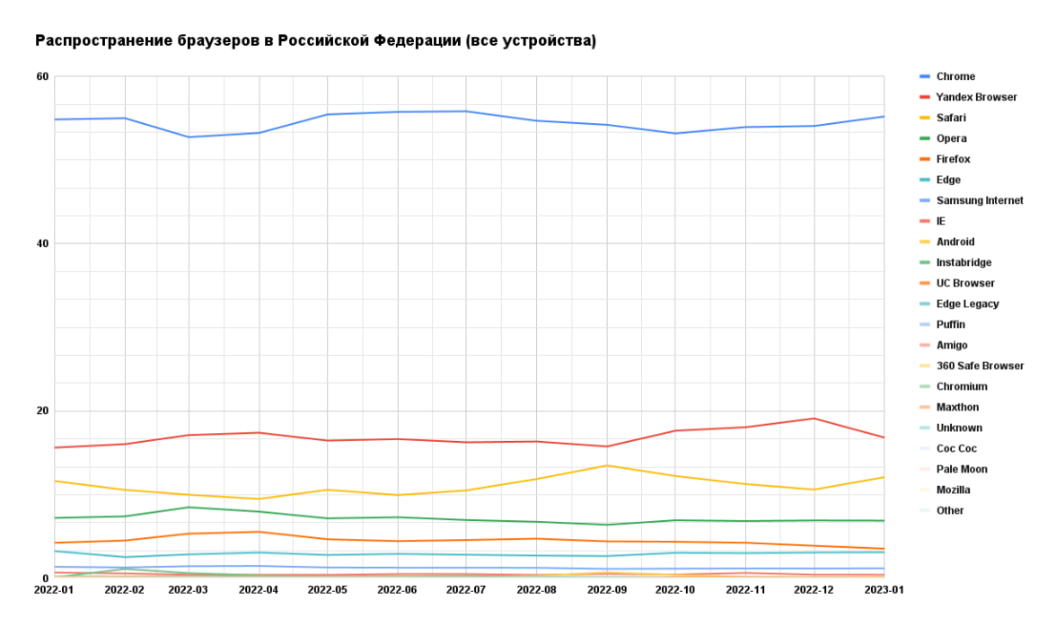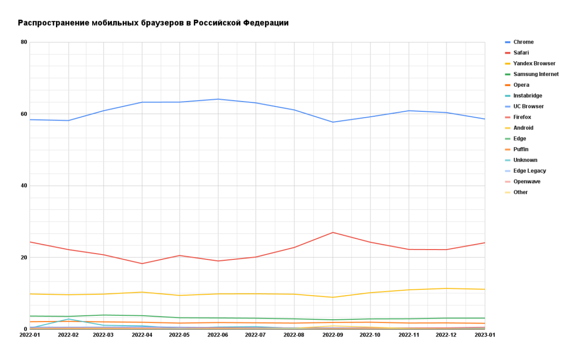 На мобильных устройствах в Российской Федерации Google Chrome является самым распространенным браузером, на втором месте Safari, на третьем браузер от Yandex.